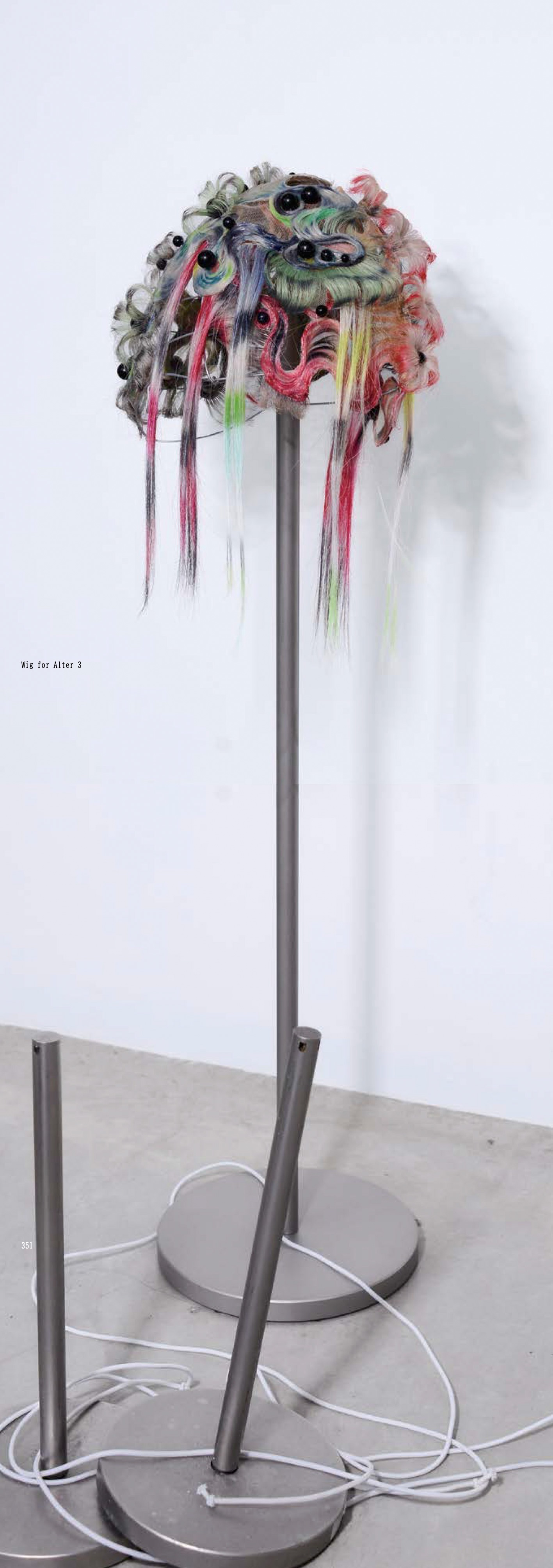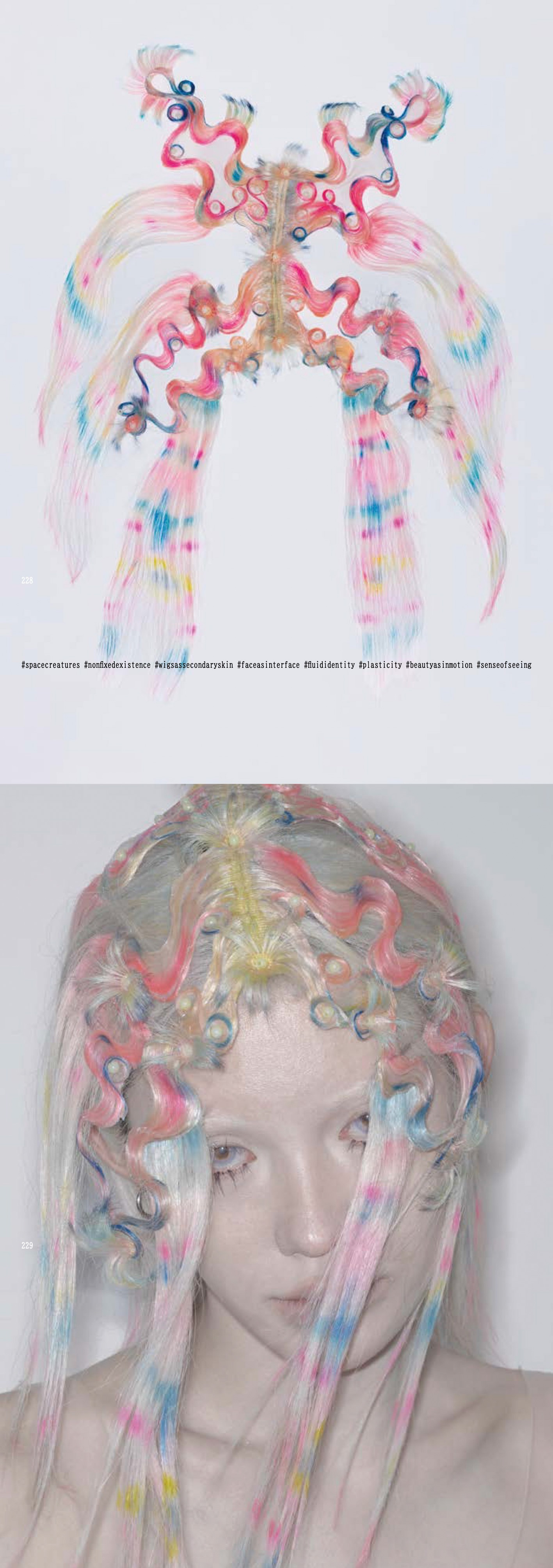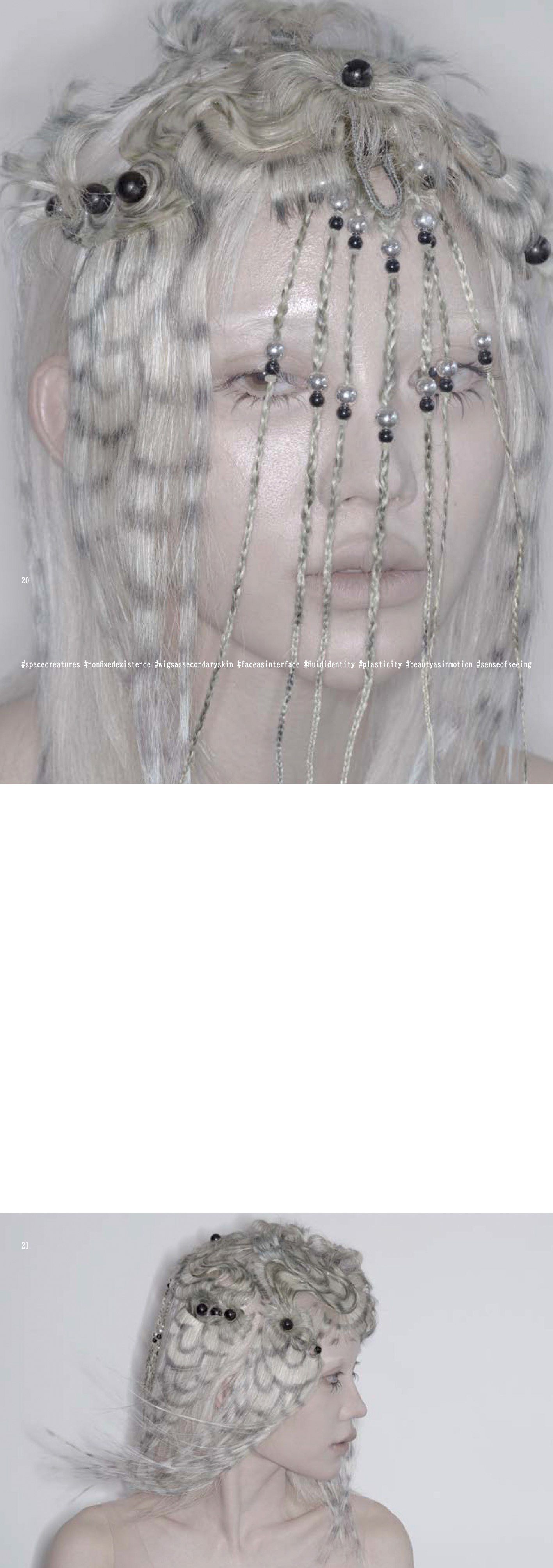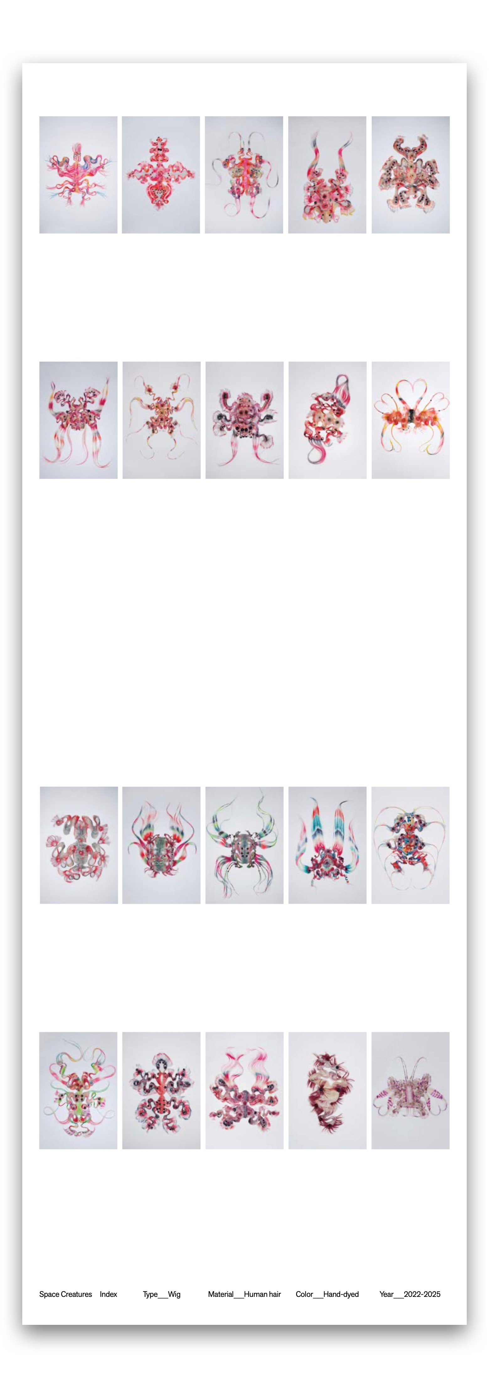 Through human hair—an intensely human material—it explores forms that resemble unfamiliar organisms, specimens, or cosmic beings, producing a sense of drift between self and other, nature and artifice, body and signal. It's a 368 page book with a sequence of face in various wigs inspired by organism forms.